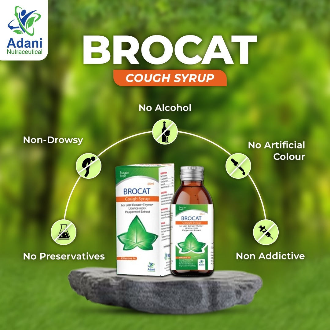 BROCAT Cough Syrup is a scientifically formulated herbal remedy designed to provide fast and long-lasting relief from cough and throat irritation. Made with a powerful blend of Ivy Leaf Extract, Thyme, Licorice Root, and Peppermint Extract, this syrup works naturally to ease respiratory discomfort, clear mucus, and promote easier breathing – all without added sugar.